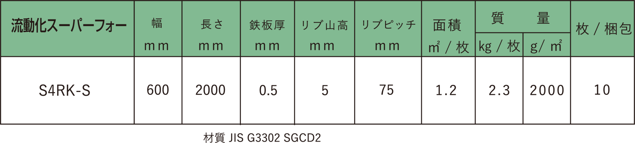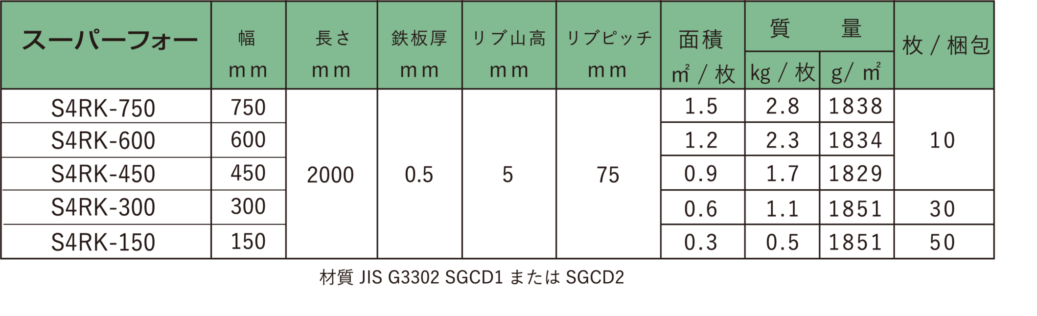 ●リブ山高5mmで低いため型枠の増打ちの寸法が少なくてすむ。板厚0.5mm。
